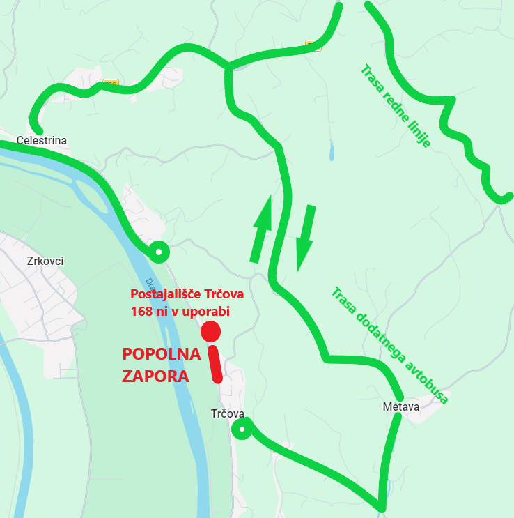 V času zapore bo zagotovljen dodatni avtobus, ki bo pokrival postajališča od Trčove – Griček do Metave.