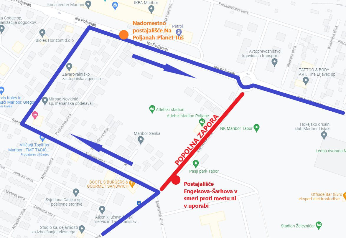 Med zaporo bo izpadlo avtobusno postajališče Engelsova–Šarhova v smeri proti mestu. Kot nadomestno v obeh smereh bo postajališče Na Poljanah – Planet Tuš.