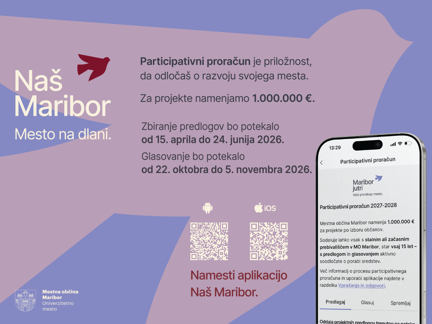 Zbiranje predlogov, finančno ovrednotenih med 3.000 in 30.000 EUR (z DDV), bo trajalo do 24. junija 2026. Projektni predlog lahko odda vsak občan s stalnim ali začasnim prebivališčem v MO Maribor, ki je dopolnil najmanj 15 let. Glasovanje bo potekalo med 22. oktobrom in 5. novembrom 2026.