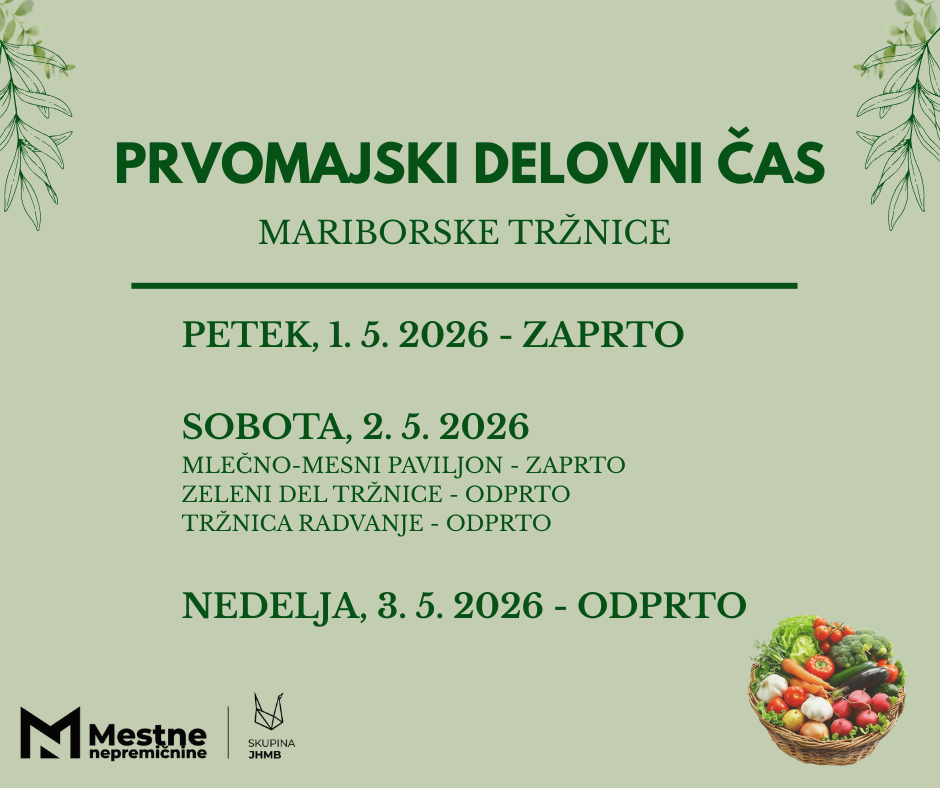 - V soboto, 2. maja 2026, bo odprt zeleni del osrednje tržnice, medtem ko bo mlečno-mesni paviljon zaprt. Ta dan bo delovala tudi tržnica Radvanje.