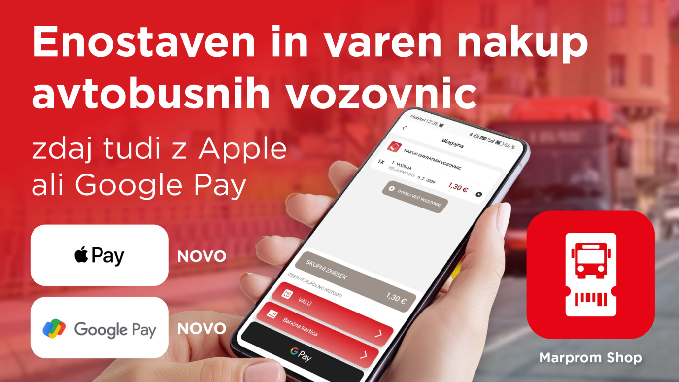 Uporabnikom mestnega potniškega prometa je odslej na voljo še sodobnejša in enostavnejša izkušnja nakupa vozovnic. Mobilna aplikacija Marprom Shop, ki omogoča tako nakup kot koriščenje vozovnic, je bila nadgrajena z novo funkcionalnostjo – plačevanjem preko Google Pay in Apple Pay.